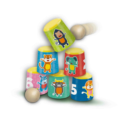 Can toss! With this game, children can have endless fun outdoors. The plastic cups can be set up in different positions, with the numbers or animals facing forward. Who can knock over the most cans with the two wooden balls and achieve the highest score?