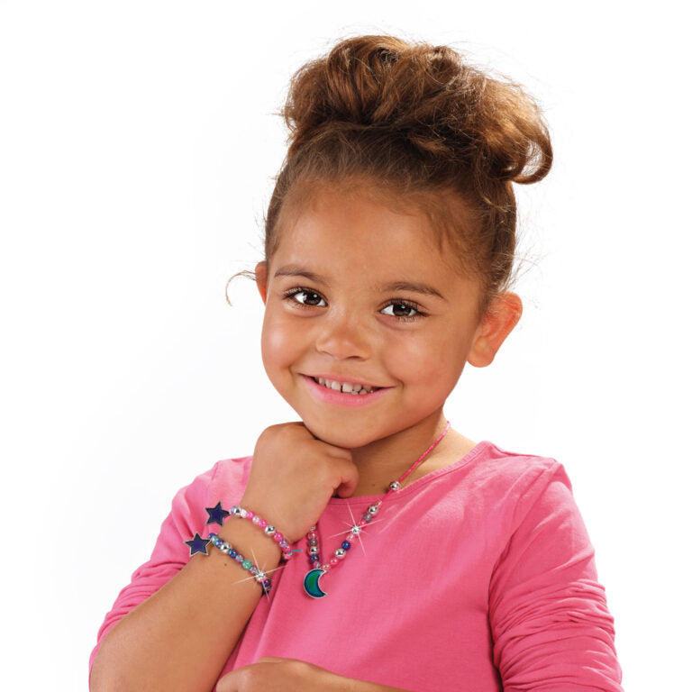 What mood are you in today? With the galaxy mood jewellery, children can make special jewellery. The charms show your mood! Children can not only create beautiful bracelets and necklaces but also be amazed by the changing colours of the charms! The set contains temperature-sensitive charms in a star shape, and a moon, pearl and silvered coloured beads, cord and elastic for creating different pieces of jewellery.