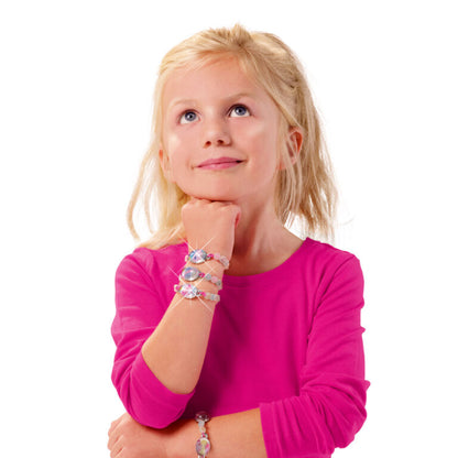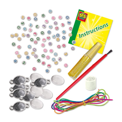 These galaxy bracelets can not only be made all by yourself but they also glow in the dark! The set contains six charms you can make yourself! Choose a picture for each charm, stick it on the base, decorate with glitter and finish with the transparent domed stones. With the glow-in-the-dark beads, homemade charms and elastic, children can create and wear the most amazing jewellery.
