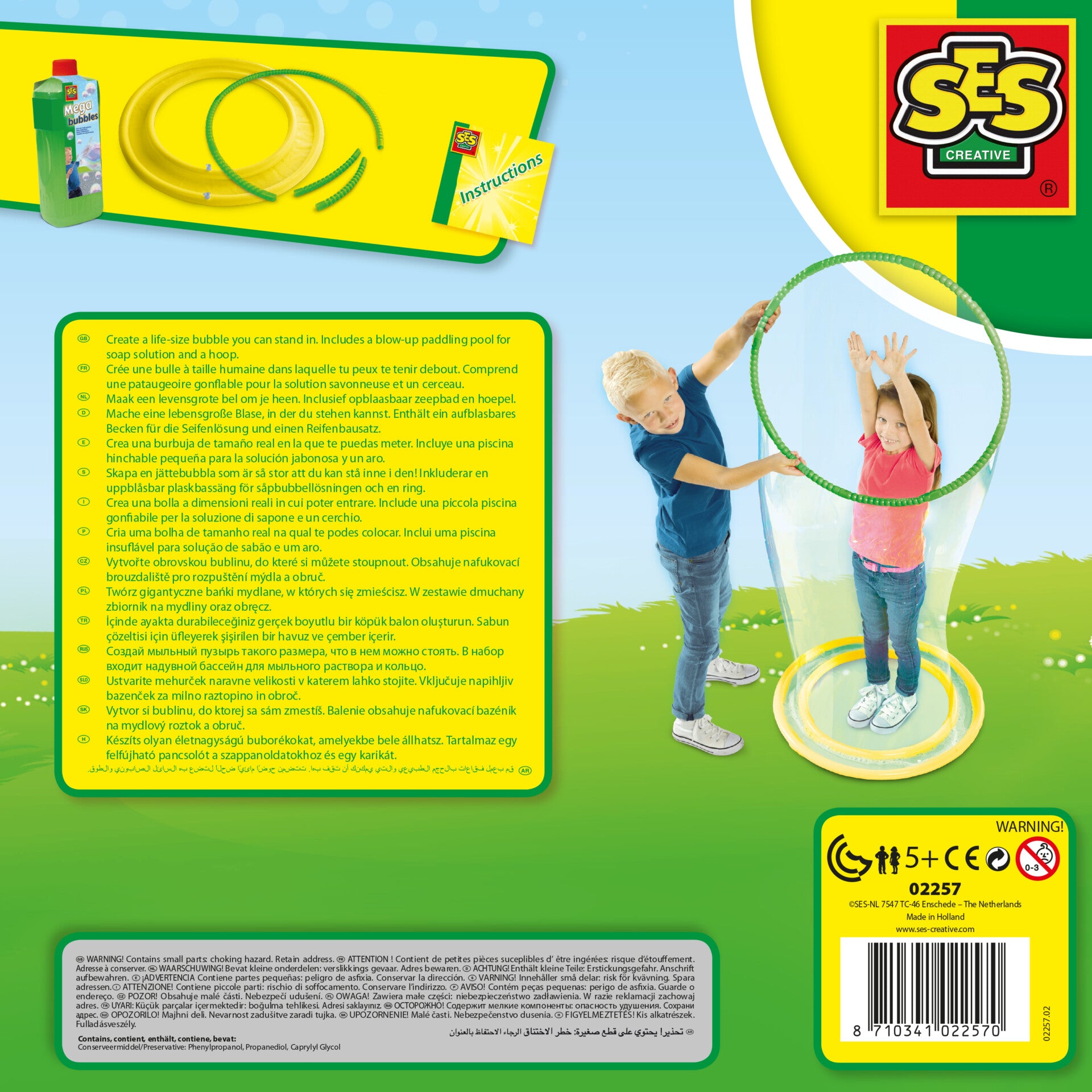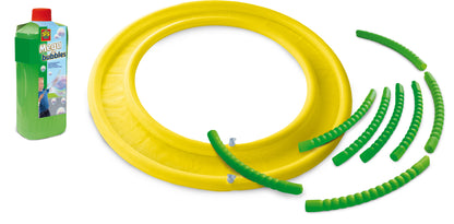 Is there anything more fun than playing with bubbles? Playing with mega bubbles! Inflate the soap bath and fill it with the soap solution. Slot the bubble ring parts together to create a large hoop. With the specially developed super-strong soap solution, you can make bubbles that are so big, you can even stand inside them.