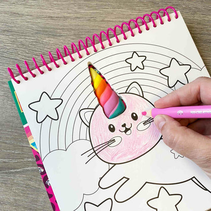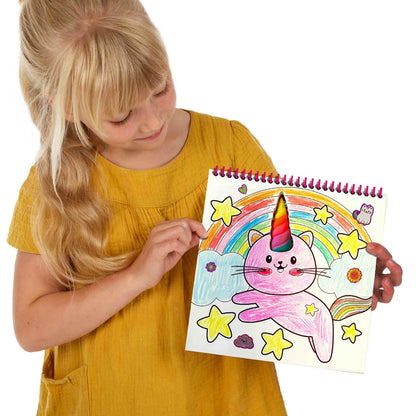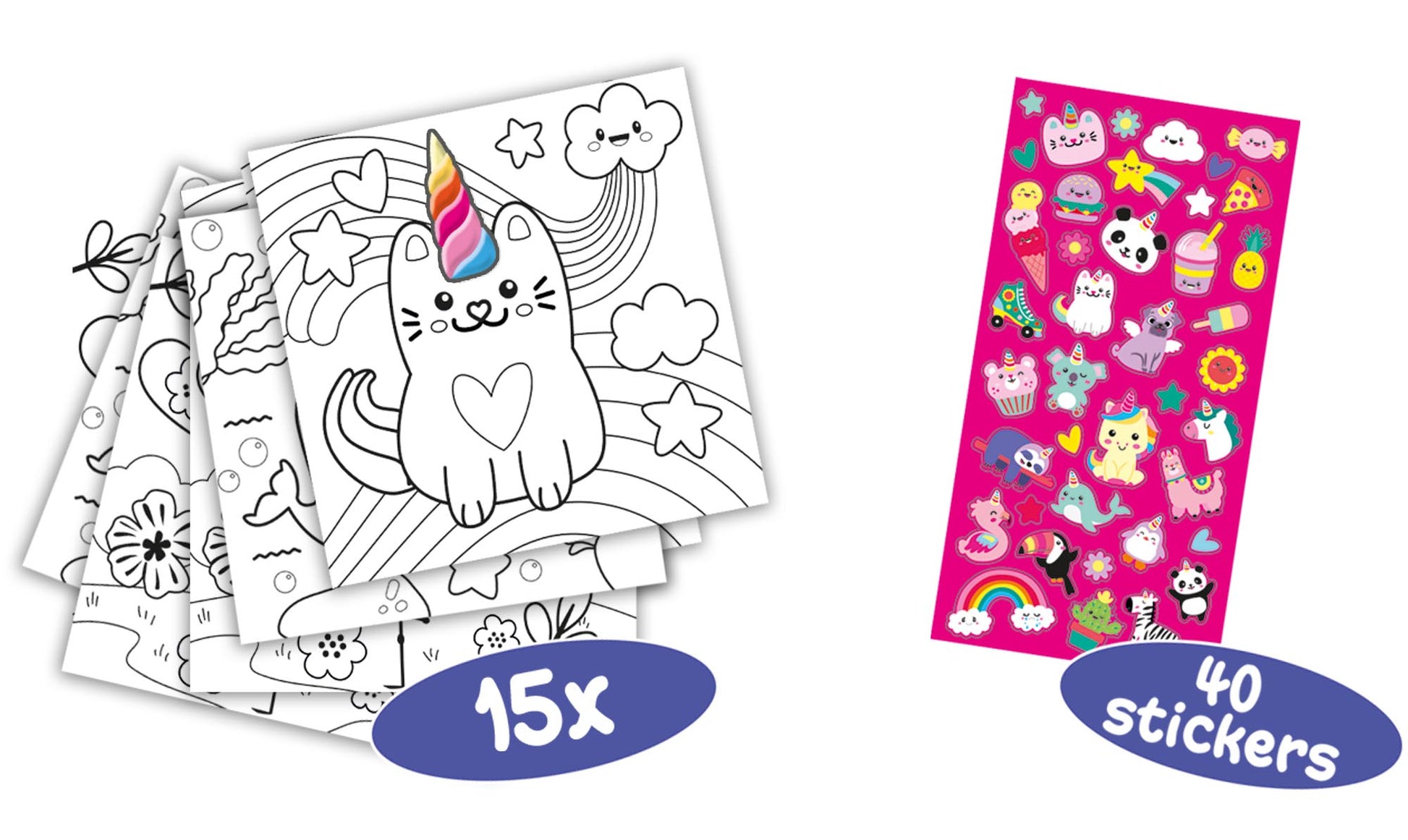 15 colouring pages with fun Uni-animals to colour. The puffy foam horn is visible on each page, making this coloring book unique With 40 extra glitter stickers to decorate your drawings.